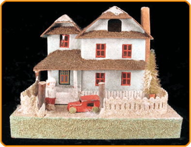 When we got into this hobby, we found a high level of interest in restoring, or in some cases, reconstructing vintage, but damaged, cardboard Christmas "putz" houses. Doors and windows to replace those punched out by little fingers were available, and several techniques for restoring, or in some cases, replacing the various kinds of mica and glitter coatings were documented. But one class of these